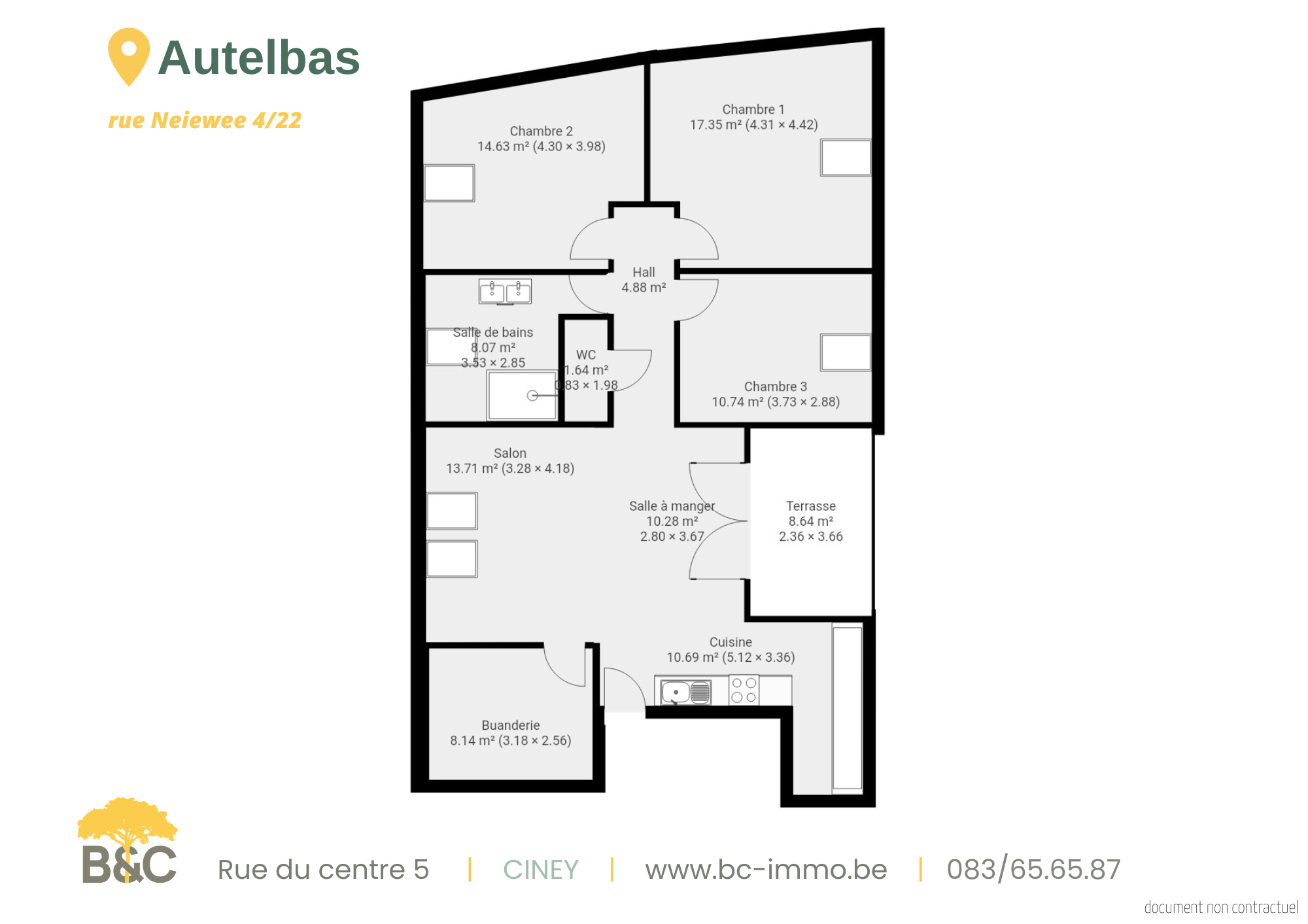 À découvrir dans le charmant village d’Autelbas, lumineux appartement construit en 2019 (encore sous garantie décennale), dans un état proche du neuf, idéalement situé à seulement 5 km de la frontière luxembourgeoise tout en offrant un cadre de vie calme et verdoyant. Il se compose d’une spacieuse pièce de vie avec cuisine équipée offrant un accès direct à une agréable terrasse privative, d’un hall de nuit desservant trois chambres, une salle de douche avec WC ainsi qu’un WC indépendant. Le bien dispose également d’une grande buanderie, d’une cave en sous-sol, de deux emplacements de parking (dont un couvert) et d’un jardin partagé. Situé dans une petite copropriété de 8 appartements, il allie confort et tranquillité. Côté technique, tout le confort est au rendez-vous : électricité conforme, chauffage sol , châssis PVC double vitrage, PEB B, système de traitement de l’eau au CO₂ et citerne d’eau de pluie commune de 10.000 litres alimentant les WC, le lave-linge et l’arrosage des extérieur, sans oublier une toiture en ardoises naturelles. Prix : faire offre à partir de 449.000 €, sous réserve d’acceptation des propriétaires.