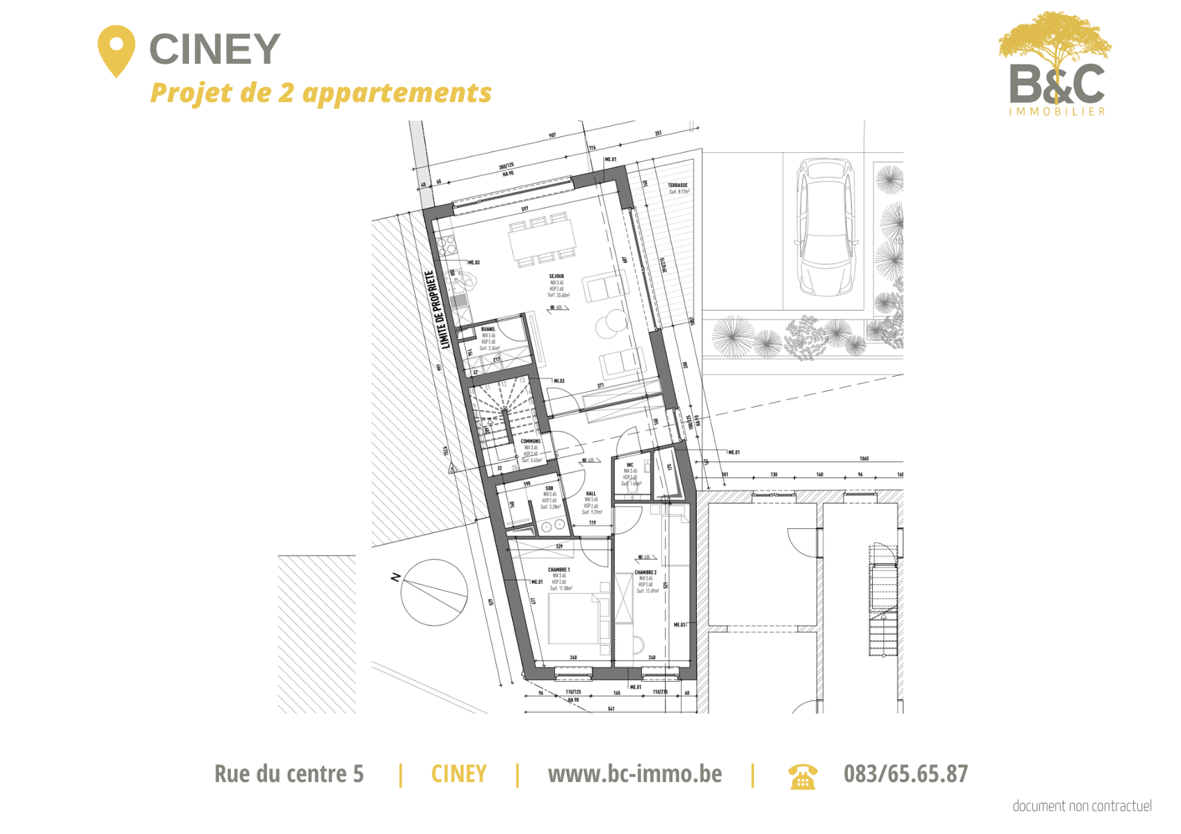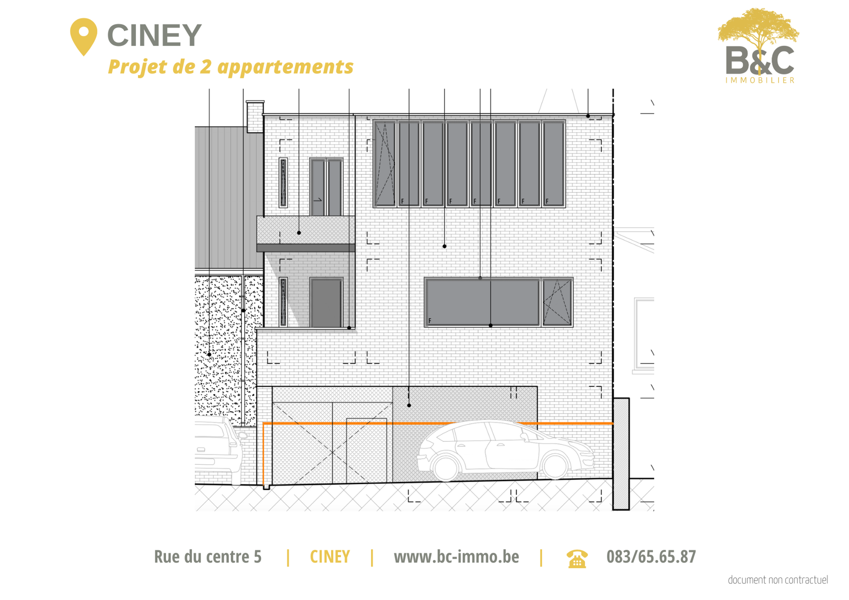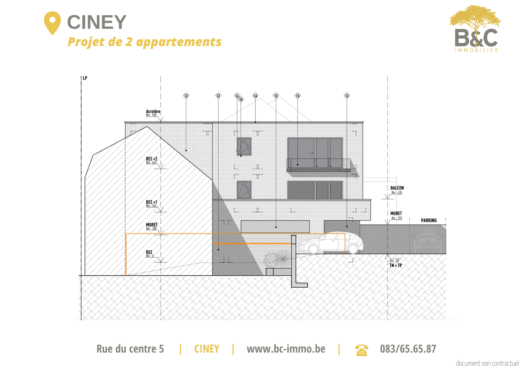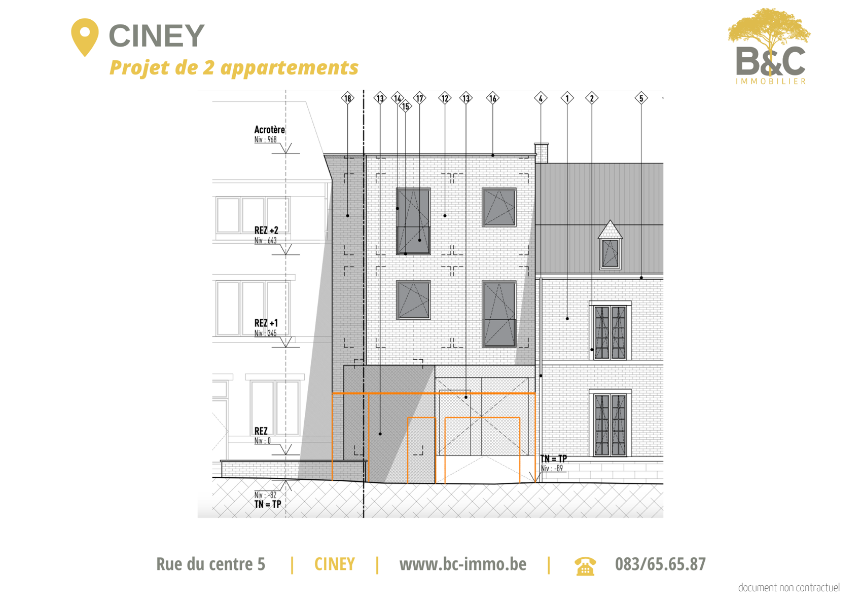 À deux pas de la gare de Ciney et de toutes les commodités, ce terrain à bâtir offre un projet à taille humaine avec permis octroyé pour la construction d’un immeuble comprenant 2 appartements de ± 80 m², chacun avec terrasse. La conception est simple, fonctionnelle et économique, incluant une cage d’escalier centrale, un local vélo, un local poubelles et un aménagement pensé pour optimiser l’espace et le confort. Le permis permet de démarrer les travaux sans délai et est valable jusqu'au 25/07/2027. Idéal pour un petit projet d’investissement ou une première promotion. Renseignements et plans disponibles sur demande à l’agence. Visuels non contractuels.